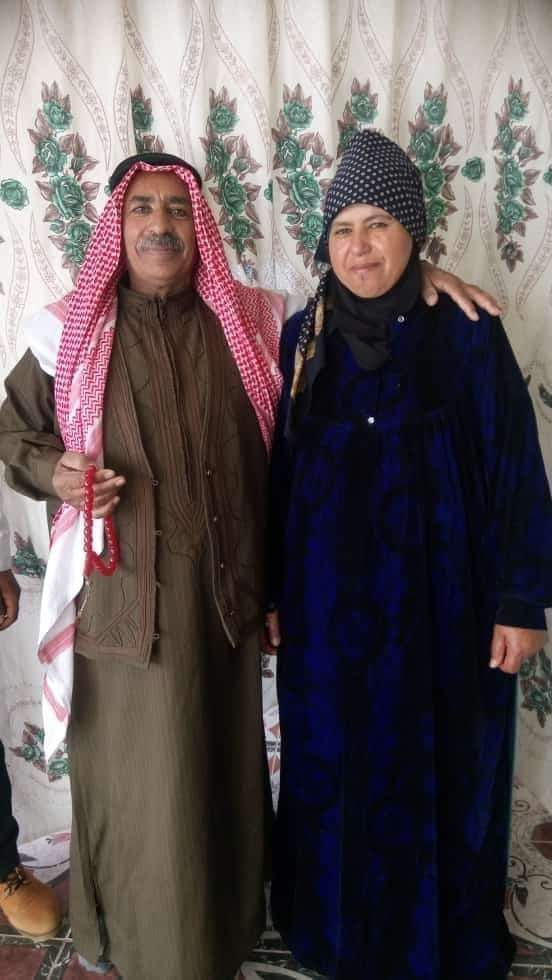 Mrs. Marziya Rashid Al-Ramthan and her husband Atallah Shati Al-Ramthan (Abu Musabih) died in their house which was destroyed by the strike. Multiple sources posted a photo of the victims, a woman wearing a long blue dress and a black with white dots hijab; next to her, her husband with a mustache, thick eyebrows and big black eyes wearing a long brown thawb and a traditional red Keffiyeh while holding a red pearl collar. Photos of the rising smoking clouds, a warplane, and the debris were posted as well.