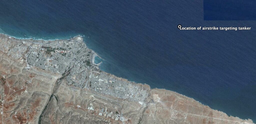 Reports of the incident mention an airstrike targeting an oil tanker five kilometers off the coast of Derna’s port (درنة). After investigating visual material from sources, we narrowed this location down to 32.7798944, 22.70505.