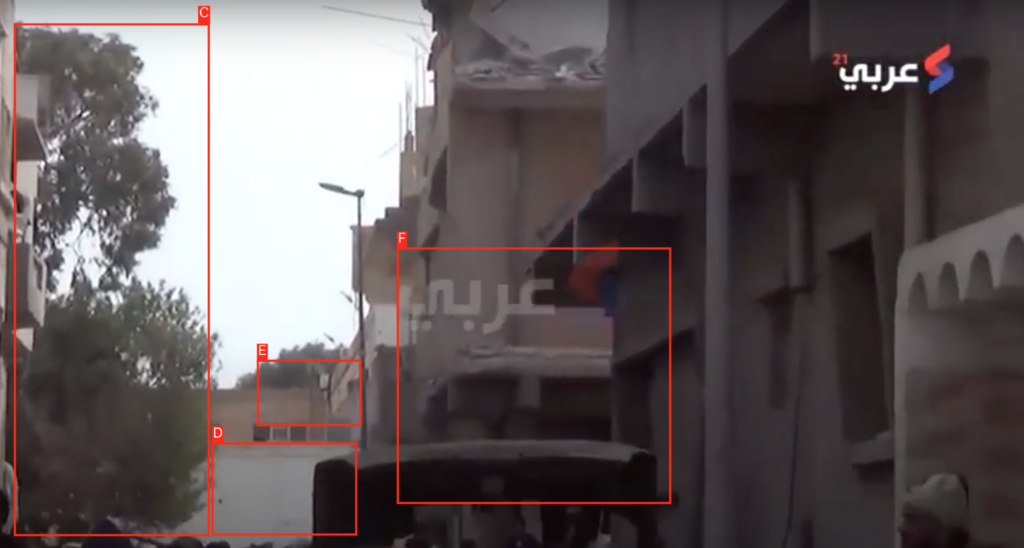Image from news report showing street targeted by airstrike. Note that tag F is the entrance to a street leading to the right of this photo.