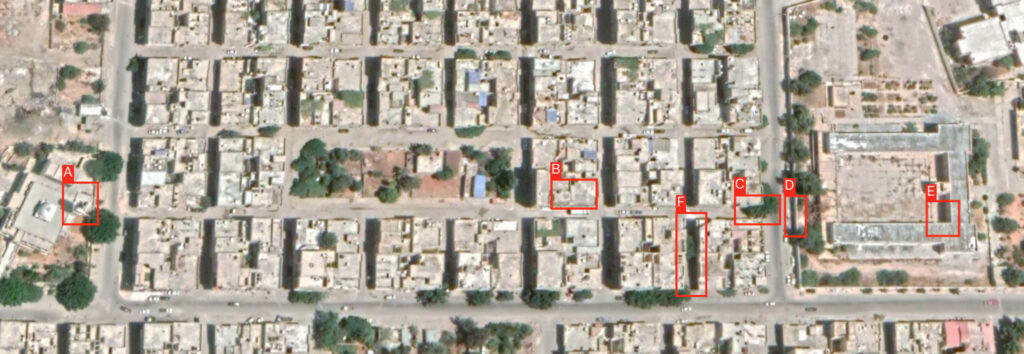 Satellite image showing distribution of features tagged in photos of neighborhood hit by the airstrike.