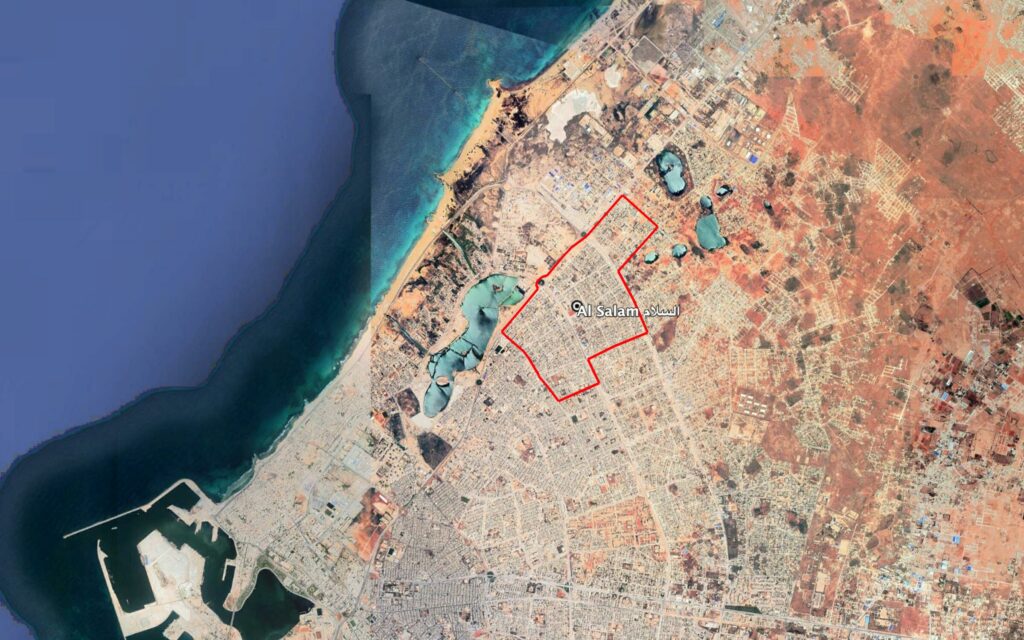 Reports of the incident mention the neighbourhood of Al Salam (السلام), for which the generic coordinates are: 32.125758, 20.098082. Due to limited satellite imagery and information available to Airwars, we were unable to verify the location further.