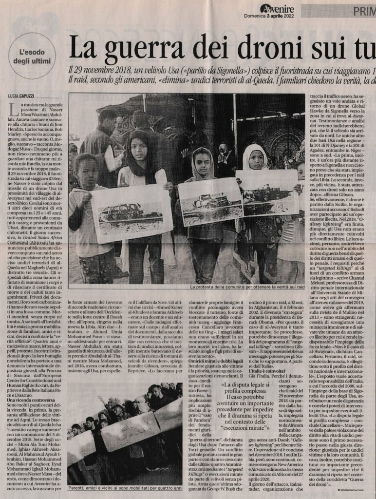 Avvenire also provided information on the complaint filed in Italy: the complaints claim that the November raid started from the Sigonella base, normally used by AFRICOM as part of the anti-ISIS “Odyssey lightning” air campaign to free Sirte. “The day of the attack, Italmiradar, an organization that tracks air traffic, reported the flight going and returning of a Global Hawk drone from Sigonella towards the area where al-Awaynat is located. Testimony and analysis of the land would indicate, also, that the plane came from the north. The only other two US bases in the region – 101 N’Djamey and 201 Agadez, both in Niger, are south. “The first, in addition, is an hour farther away in respect to Sigonella and there is no evidence that it had been previously used for a raid in Libya. The second, instead, is closer but was equipped with drones only a year after” confirmed Gibson. If, effectively, the drone left from Sicily, the organizations accuse italy of participating in an illegal operation. In 2018, “Odyssey lightning” was over so the US was no longer directly involved in the Libyan conflict. Their actions, therefore, should be placed not in the context of the law of war but in that of human and criminal rights… The complaint wants to ascertain the responsibility of Italy, explained in the 2006 agreement on the use of the Sigonella base by the US, gives a guarantee role and related powers of intervention to prevent any wrongdoings of use.”