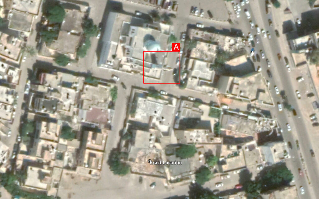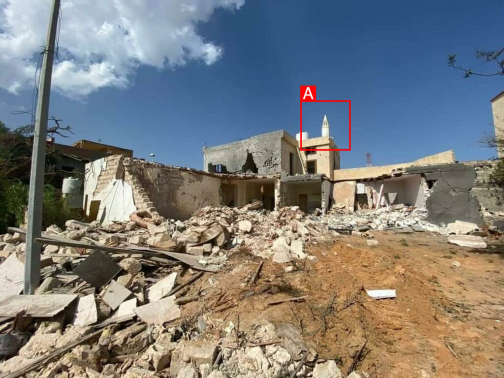 Reports of the incident mention a ministerial building being struck in the neighbourhood of Al Fornaj (الفرناج). Analyzing audio-visual material from sources, we have narrowed the location down to these exact coordinates: 32.848811, 13.238981.