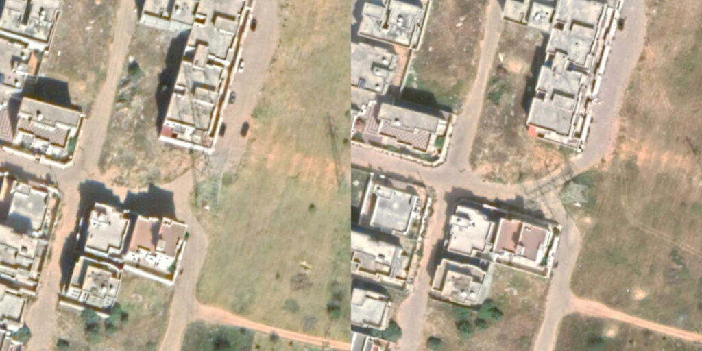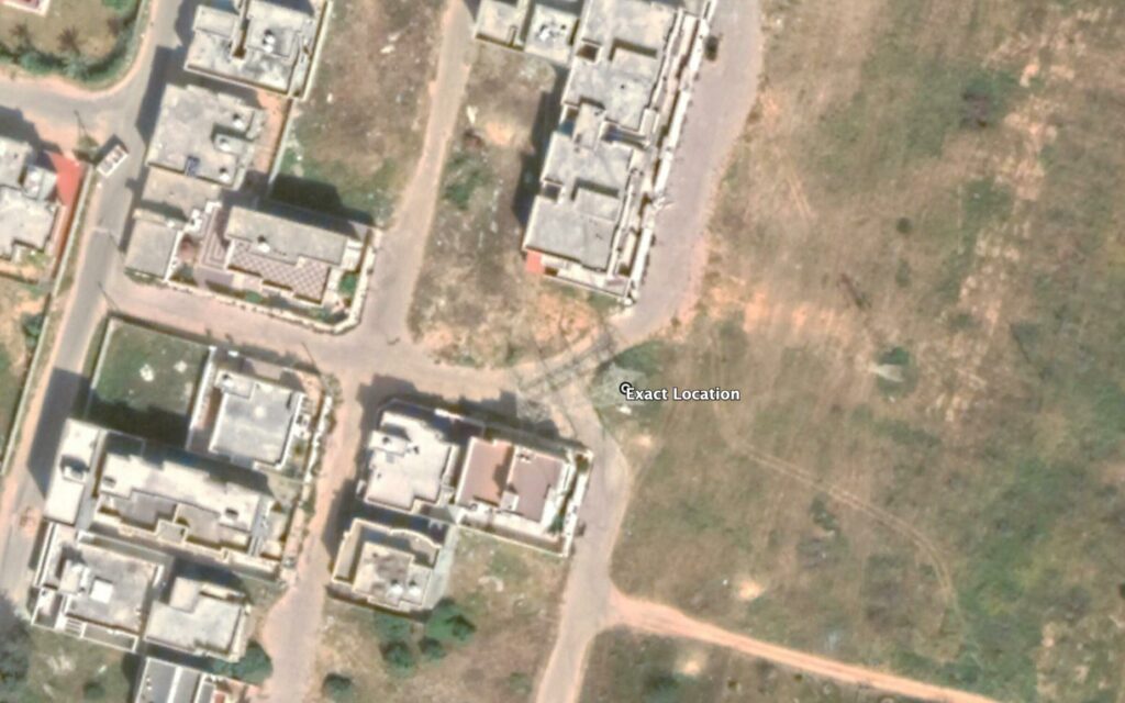 Reports of the incident mention a residential area being struck in the neighbourhood of Al Hadaba Project (مشروع الهضبة). Analyzing audio-visual material from sources, we have narrowed the location down to these exact coordinates: 32.805003, 13.204025.