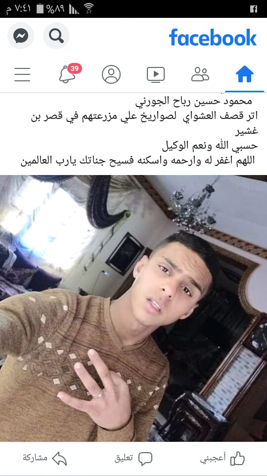 Facebook site Tk Yahrouq Kl shy first noted that “Several shells landed in Qasr Bin Ghashir area.” However this was later updated to note that Mahmoud al-Jurni was killed “as a result of the fall of a random shell on their farm in the Qasr Bin Gashir area.”