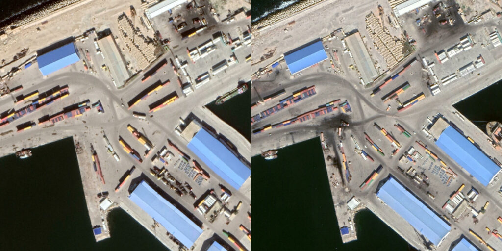 Evidence of the strike can be seen in a comparison of satellite imagery available. On the left an image from February 8th, 2020, and on the right an image from February 27th, 2020.