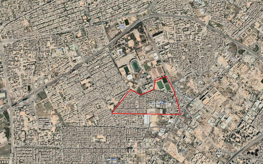Reports of the incident mention the neighbourhood of Gadah (قدح), for which the generic coordinates are: 32.854211, 13.138275. Due to limited satellite imagery and information available to Airwars, we were unable to verify the location further.