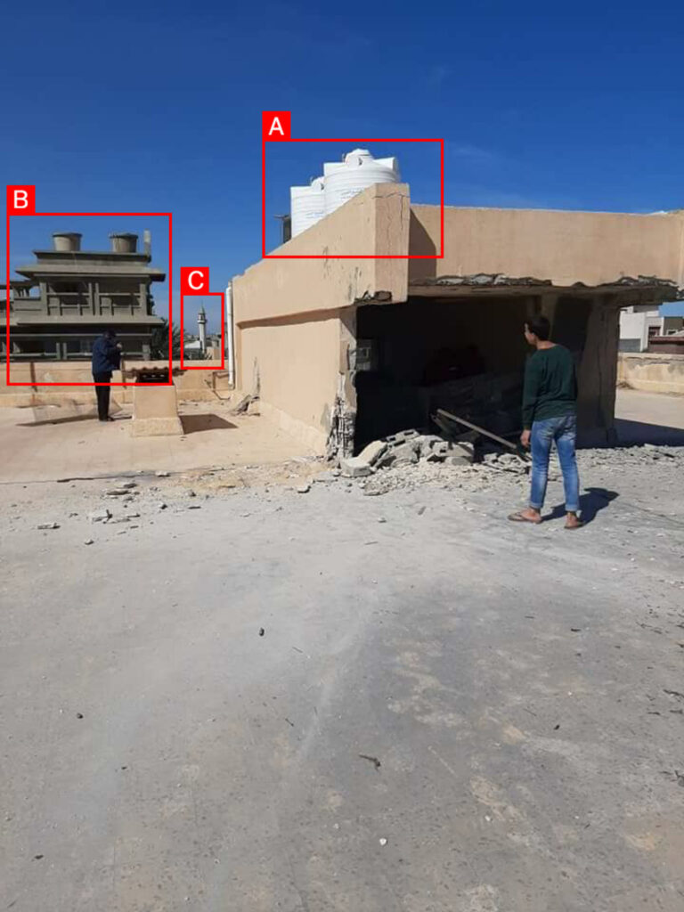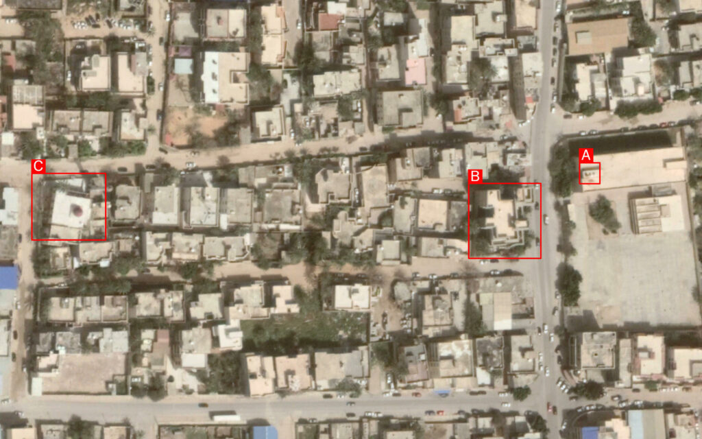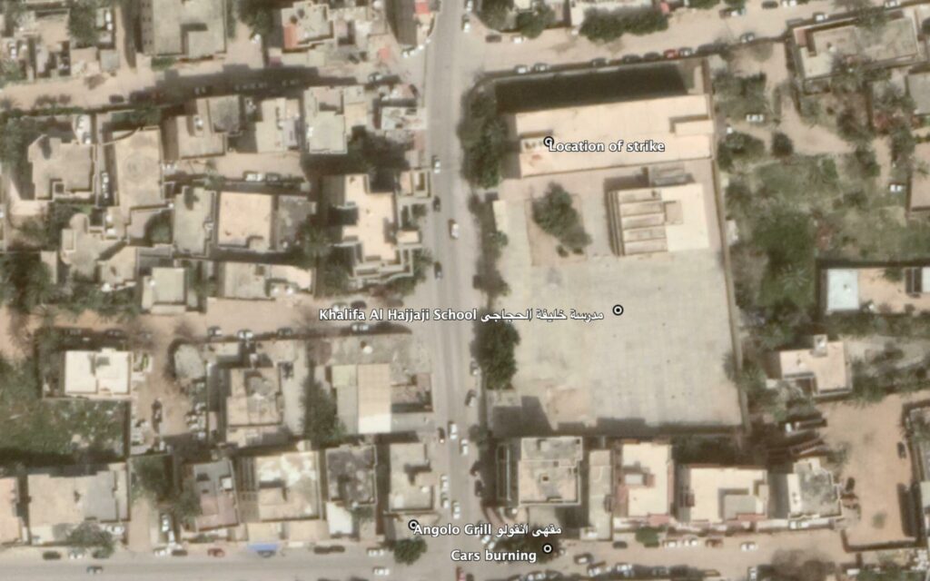 Reports of the incident mention the area of Khalifa Al Hajjaji School (مدرسة خليفة الحجاجي) being struck, setting vehicles on fire in the vicinity. The exact coordinates for both of these locations are 32.90501, 13.25497 for the School, and 32.90400, 13.254933 for the site of the cars burning.