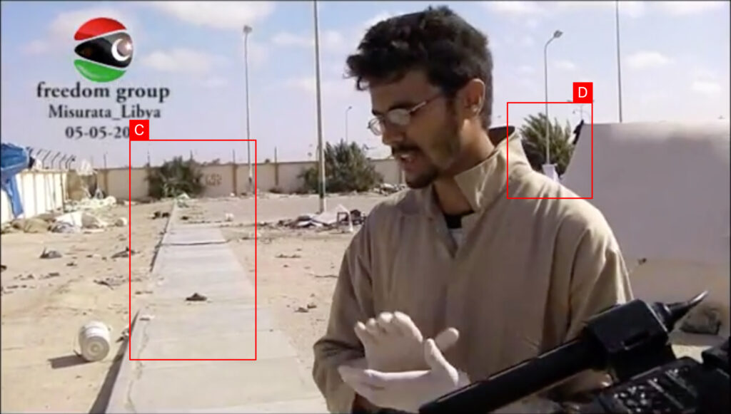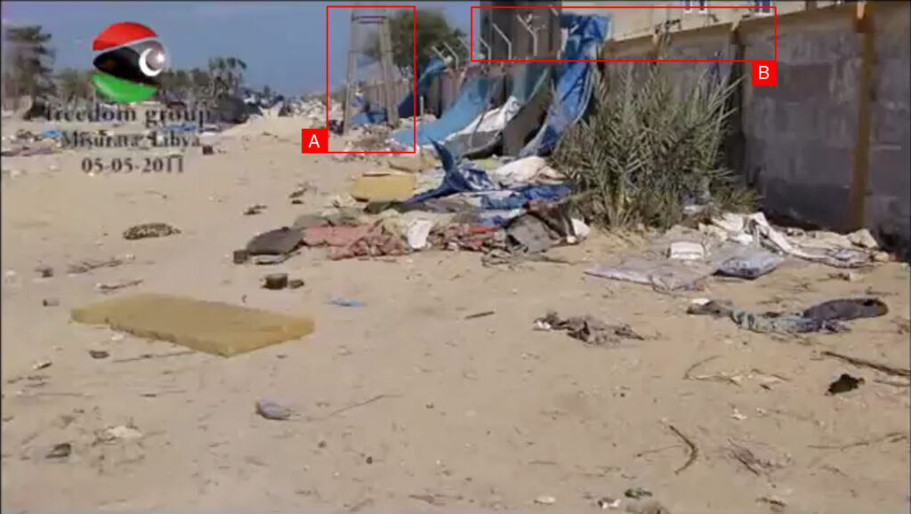 Reports of the incident mention a refugee camp being struck in the vicinity of Qasr Ahmed (ميناء قصر أحمد). Analyzing audio-visual material from sources, we have narrowed the location down to these exact coordinates: 32.344133, 15.198531.