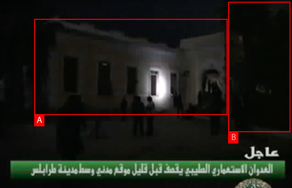 Reports of the incident mention the building of the High Committee for Children ( العليا للأطفال وسط) being struck in central Tripoli (طرابلس). Analyzing audio-visual material from sources we have narrowed down the location to these exact coordinates: 32.898242, 13.206442.