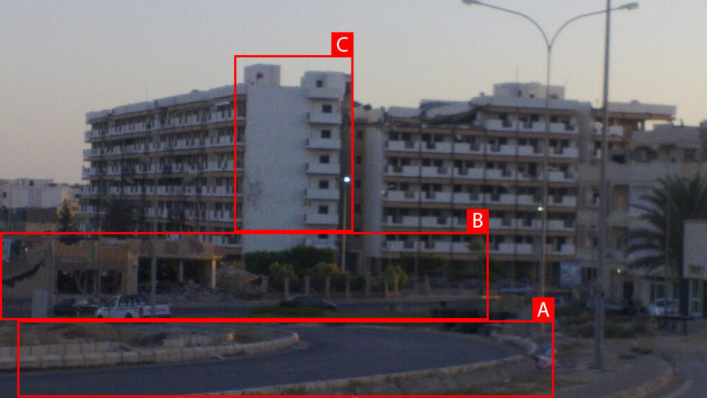 Reports of the incident mention the Al Tam’een apartment complex (عمارة التأمين) being struck in downtown Sirte (سرت). Analyzing audio-visual material from sources we have narrowed down the location to these exact coordinates: 31.205986, 16.582817.