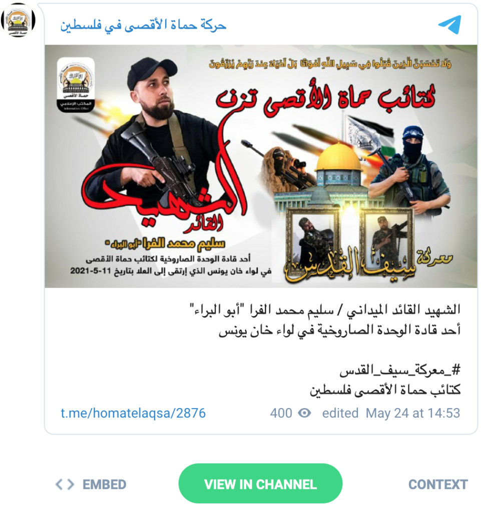 In a Telegram channel, run by the Al-Aqsa Martyrs Brigade, it was revealed that Salim Muhammad Al-Farra “Abu Al-Bara” had been the commander of a missile unit in the Khan Yunis Brigade.