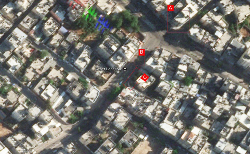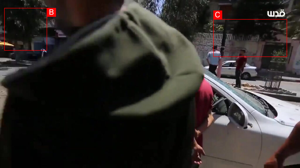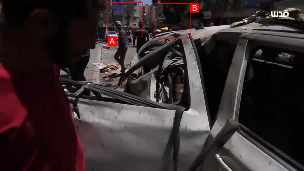 Reports of the incident mention a vehicle being struck on Al Maghribi street (شارع المغربي), in the city of Gaza (غَزَّة). Analyzing audio-visual material from sources we have narrowed down the location to these exact coordinates: 31.508528, 34.449762.