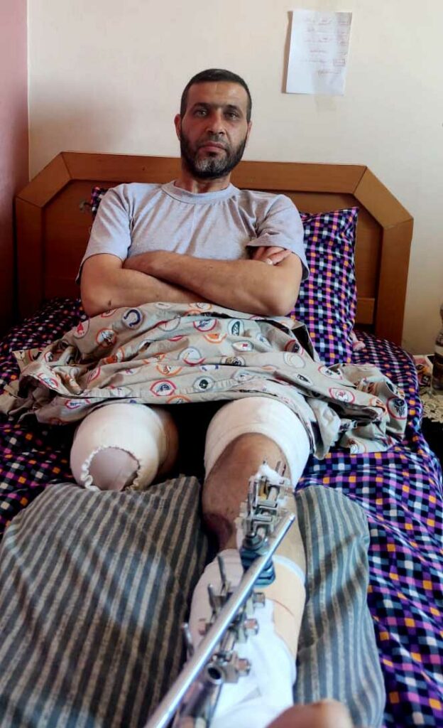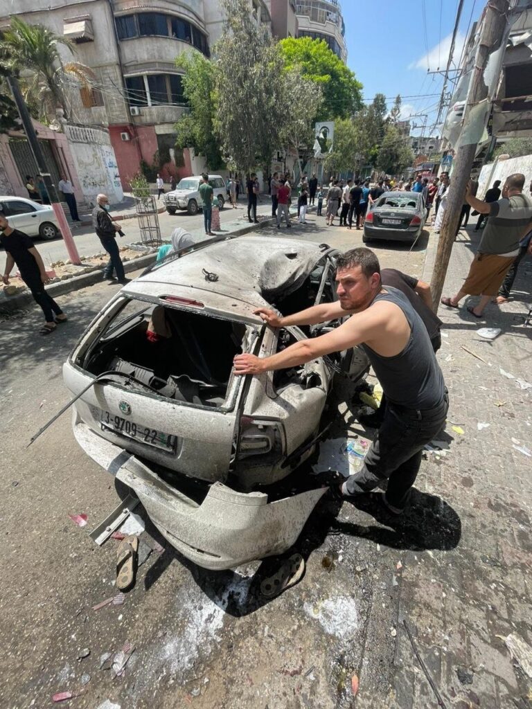 B’Tselem collected testimony from Mu’awiyah al-Wahidi, 42, a father of two who owns a barbershop near the scene of the incident: On Wednesday, 12 May 2021, I went to my barbershop on al-Mughrabi Street in the a-Sabra neighborhood. At around 11:00 A.M., I was sitting at a tailor shop that my brother owns along with my neighbor, Nader al-Ghazali, by my barbershop. While we were sitting there, Nader’s cousin, ‘Abd a-Salam al-Ghazali, arrived and Nader went out to meet him. A minute after Nader stepped out, I heard a loud explosion outside the shop. I ran outside and saw that Nader had been hit in the chest and was bleeding. I saw his cousin had been killed. I looked around and saw a white Skoda that had been bombed, with martyrs inside. I went back to Nader and tried to carry him away from there. Across the street I saw our neighbor Mansur a-Darimli, whom we call Abu Rami, lying on the ground. I dragged Nader about 50 meters away and then I dropped him. Blood came out of his mouth. A woman called out to me from a balcony to tell him to recite the Shahadatain prayer, and he started saying, “There’s no God but Allah.” Then I heard another missile and it hit me. It was four or five minutes after the first missile. I also started reciting the Shahadatain. I didn’t know what was happening to me and where I’d been hit. They took me to a-Shifaa Hospital. The doctors amputated my right leg above the knee. I have shrapnel in my back and head. In my right leg, I have a large flesh wound. After seven days, I was transferred to al-‘Awda Hospital for further treatment and I’m still there. I was later told that my neighbor Nader, his cousin and my neighbor Mansur a-Darimli were all killed in the strike, along with the al-Hittu family, who were standing by a taxi, and their taxi driver.”