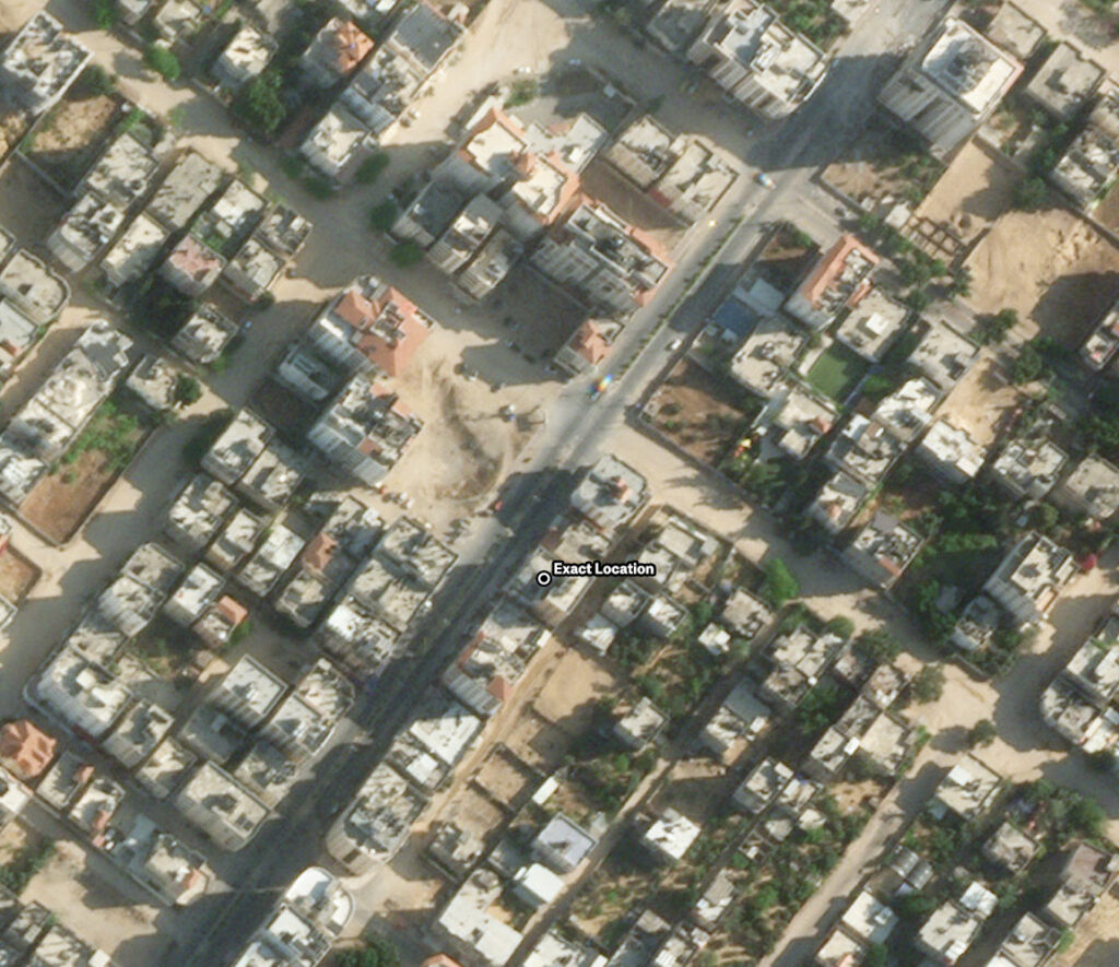 Reports of the incident mention an apartment being struck in the Tel Al Hawa (تل الهوا) neighbourhood of Gaza (غَزَّة). Analyzing visual material from sources, we have narrowed down the location to these exact coordinates: 31.508687, 34.432846.
