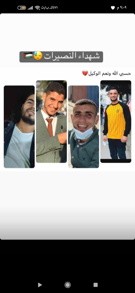 @Tartouri99 tweeted the names of the four killed: Hamza Mahmoud Al-Hour 26, Mohamed Abdel Moneim Shaheen 27, Ahmed Moeen Al-Qeraa 24, Ahmed Walid Al-Talaa. Al Mezan added that two others were moderately injured and that all casualties were residents of Nuseirat refugee camp.
