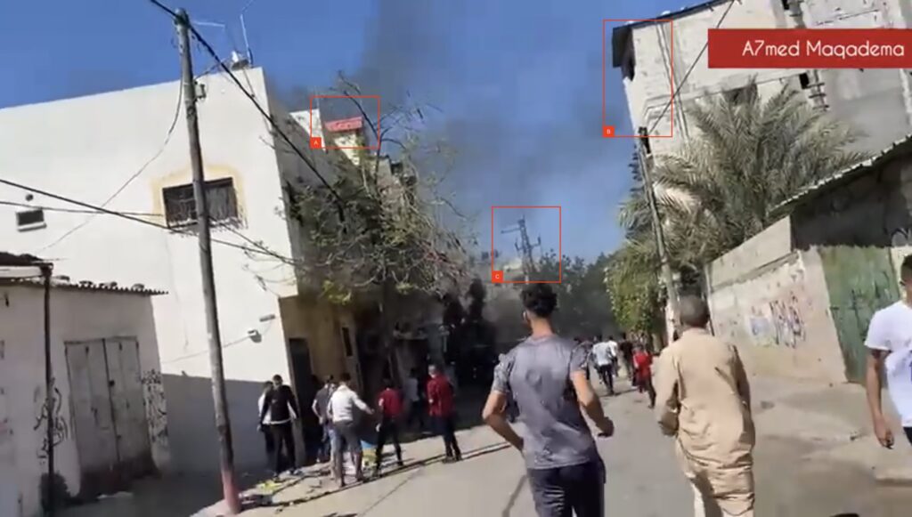 A composite still from a video showing the immediate aftermath of the incident in Al Bureij camp (مخيم البريج), May 13, 2021.