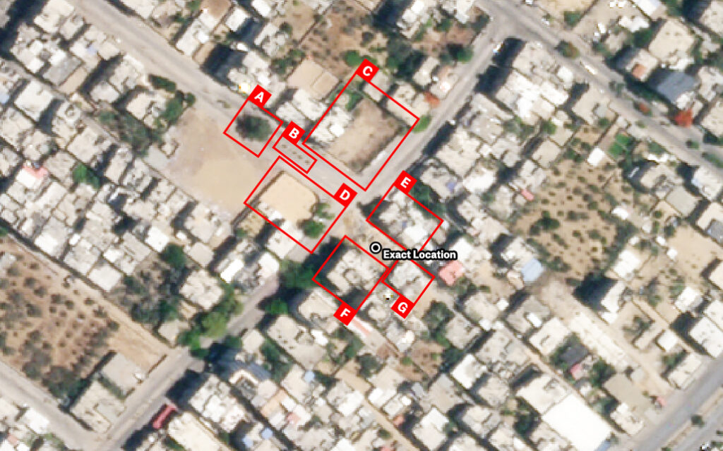 Reports of the incident mention a house in the Sheikh Nasser (الشيخ ناصر) neighbourhood of Khan Younis (خان يونس). Analyzing visual material from sources, we have narrowed down the location to these exact coordinates: 31.340836, 34.311321.