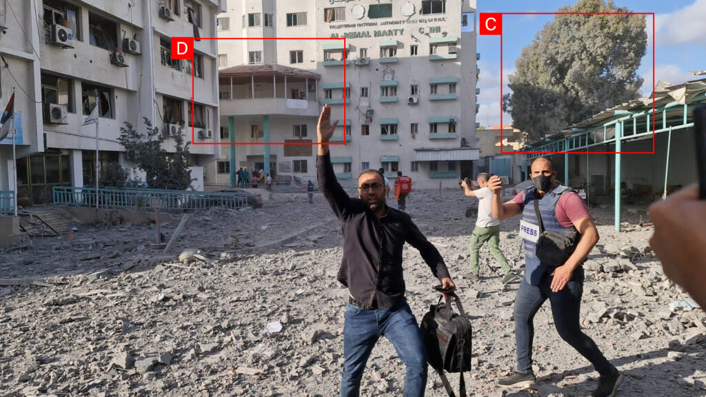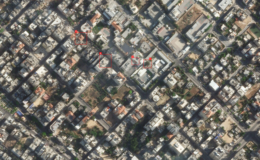 Reports of the incident mention the Al Ghazi Al Shawa building (بناية غازي الشوا) being struck. Analyzing audio-visual material from sources, we have narrowed down the location to these exact coordinates: 31.51881700, 34.44981400.