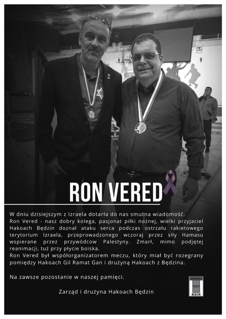 Hakoach Będzin, a Jewish soccer club in Poland, posted a tribute to him: “Today sad news has reached us from Israel. Ron Vered our good friend, football enthusiast, great friend to Hakoach Będzin suffered a heart attack during a missile attack on Israeli territory by Hamas forces supported by Palestinian leaders”.