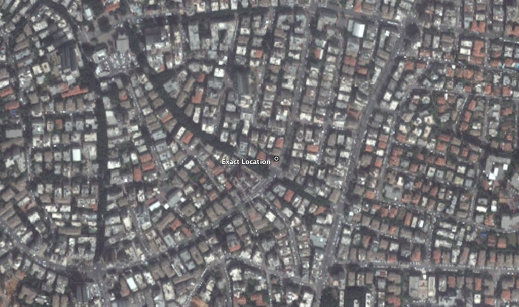 Reports of the incident mention a residential building being struck in the Ramat Gan (רמת גן) neighbourhood of Tel Aviv (תל אביב). Analyzing visual material from sources, we have narrowed down the location to these exact coordinates: 32.081325, 34.818636.