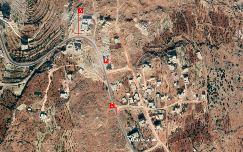 Reports of the incident mention the village of Kafrlata (كفرلاتا). Analyzing audio-visual material from sources we have narrowed these down to an exact location.