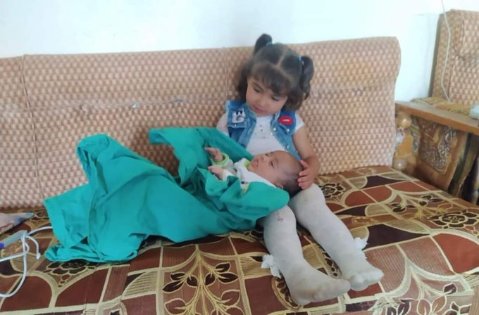 A tweet from @abuhuzaifa_ includes a picture that is identified as the two children of someone killed in the strikes on Mantef – the post does not identify their mother by name but may be referring to Wafaa Abdul Hamid Qassoum.