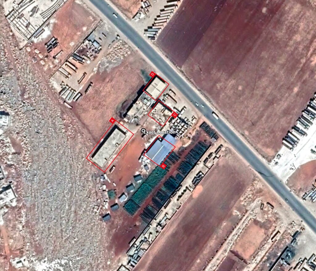 Reports of the incident mention an industrial building being struck on the road between Bab Al Hawa border checkpoint (باب الهوى) and the city of Sarmada (سرمدا). Analyzing visual material from sources we have narrowed down the location to exact coordinates.