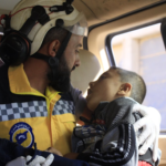 According to @SyriaCivilDefe, a child was injured by a thermal missile launched by the Syrian regime and Russian forces at the car he was traveling in with his grandfather and grandmother. Their vehicle was traveling in Deir Sinbol village.