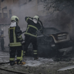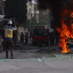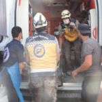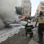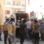 The number of the injured was later updated to 31, apparently after the afternoon attack that the SCD reported in the afternoon around 1:14 PM. SCD tweeted that “a civilian was killed and two women were injured in the initial toll of renewed missile bombardment by regime forces on the city of #Idlib this afternoon.” It added that a cluster of medical facilities in the city were hit and a fire broke out in a civilian’s car. The attached images showed a car trapped in a fire and several SCD volunteers extinguishing it. In another tweet, SCD posted a video showing the fight against fire and also the transportation of an injured man to the ambulance.