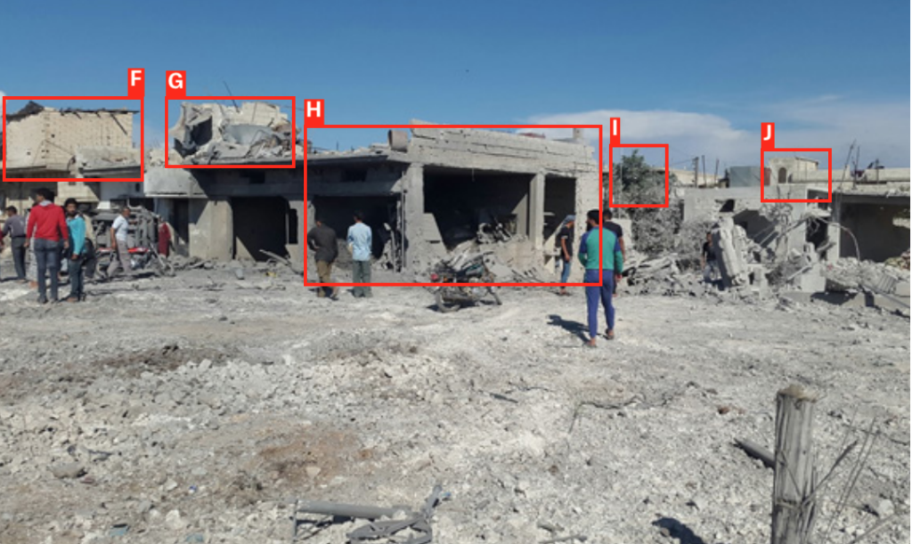 Reports of the incident mention an airstrike that targeted homes in an area called al-Makramiah located southwest of Za`faranah (الزعفرانية‎). Investigating visual material from sources, we narrowed the location of the airstrike to a block of homes on the southwest outskirts of Za’faranah. Post-strike satellite imagery also corroborates the location of the incident, for which the exact coordinates are: 34.882683, 36.770165.