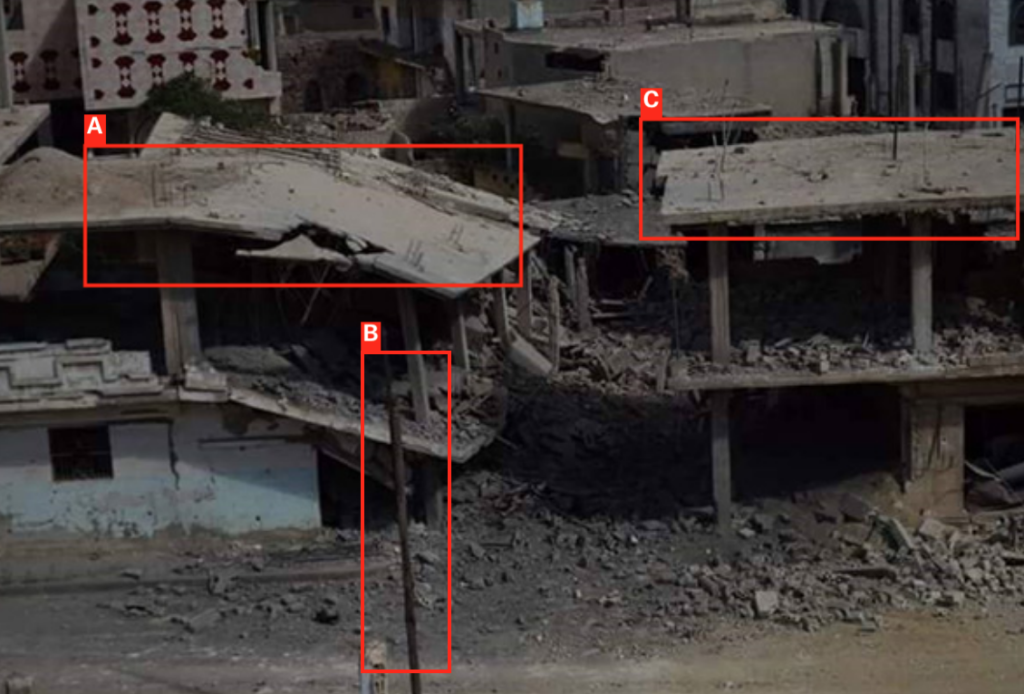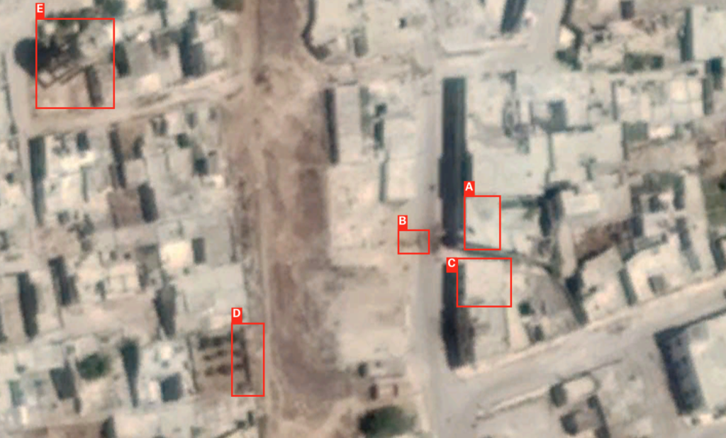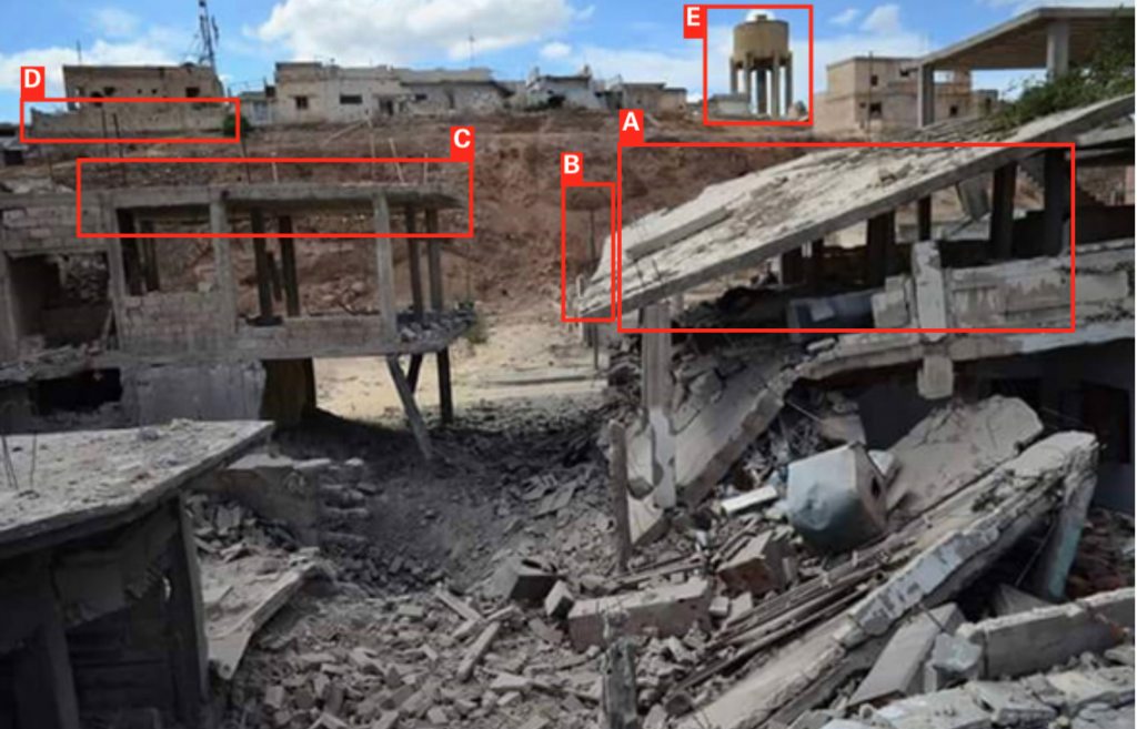 Opposite perspective of buildings destroyed in airstrike, this time also showing a walled garden (feature D) and water tower (feature E).