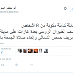 Eighteen civilians were killed in heavy airstrikes on Talbiseh, all from the Aloush and Swais families. Nine children were among the dead following at least three air raids. Graphic footage shows bombs being dropped in the centre of the town, followed by desperate rescue operations.