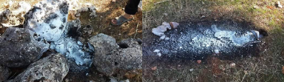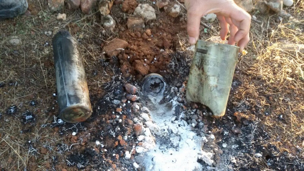 Moustafa Ghareeb, a local activist who examined the shelled region told SN4HR: “I went to the first location and saw remnants from phosphorous shelling spread over a wide area. Almost 500 meters of agricultural lands were burned as well. The bombs left remnants of molten iron which became watery fluid due to the heat as well as the black viscous substance that smelled like sewage water. The residents in the region told me that a rocket targeted the olive presser where 15 cars were present next to it; all of which belonged to civilians since we are harvesting olives these days.