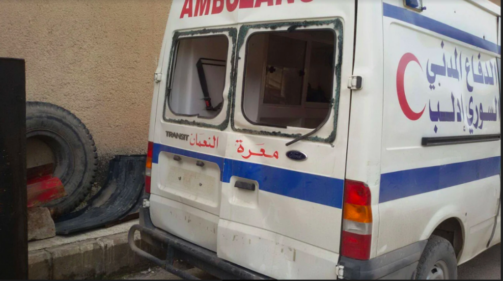 Mohamad Thakara, head of a local civil defence team which went to the shelling location, told the Network: “When we arrived there, the grove was burning and we put [the fire] down. We also collected bomb remnants… Later, Russian warplanes targeted the region with rockets thought to be vacuum rockets and targeted the olive presser, the nearby square and the bakery. We pulled out victims’ bodies from under the rubble and transported injured people. During that time we were shelled again and two members of our team were injured, and our ambulance was damaged. I took my teammates, the rest of the injured people and the victims to the hospital. The shelling caused great destruction to the agricultural lands and civilians’ cars. The Russian warplanes conducted more than 9 airstrikes on a purely civilian region. They did not only target civilians but civil defense members as well”