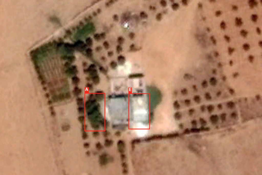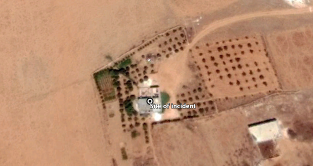 Reports of the incident mention that up to six people were killed in an airstrike in the village of Abu al Khanadak (أبو خنادق) in Hama. After investigating visual material from sources, we narrowed this location down to a compound on the northwest outskirts of the village, for which the exact coordinates are: 35.406795, 37.199541.