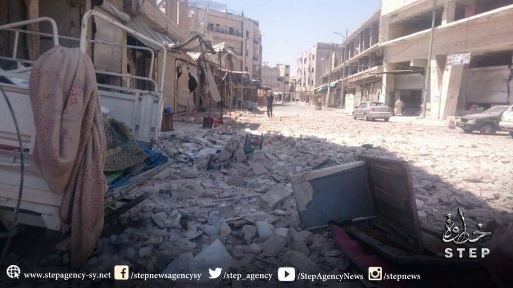 Responsibility for the strikes was attributed to both regime and Russian warplanes by the Syrian Network for Human Rights and the Shaam News Network. Halab Today blamed solely Russia, and published a video showing an injured man looking for his son, who he’d lost during the airstrikes.