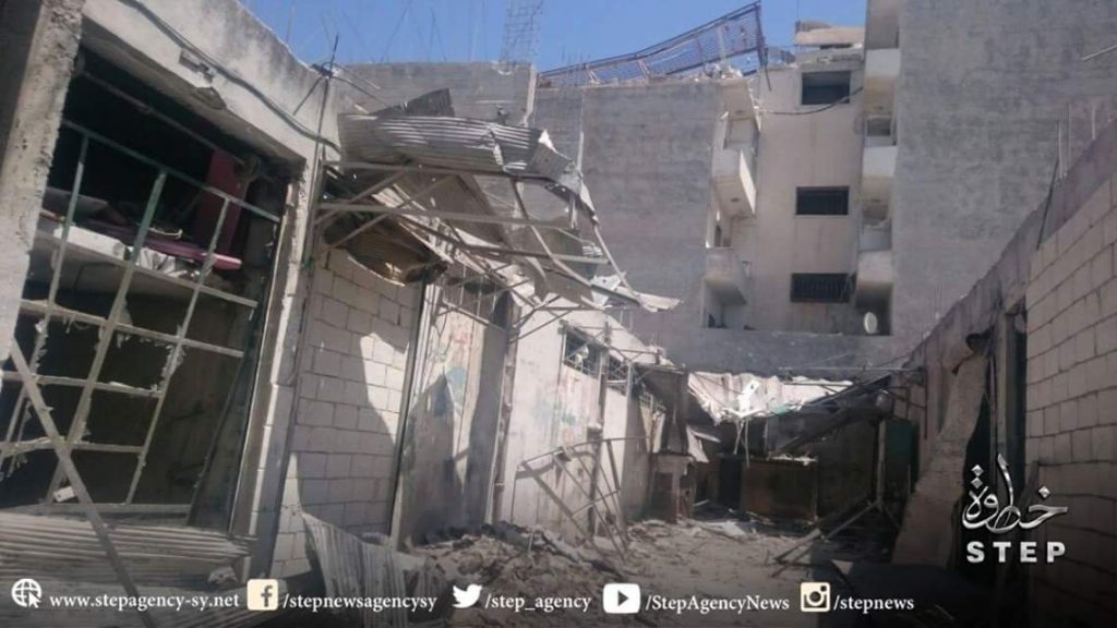 Videos posted by Syrian Press Center show the physical destruction and fires caused by the airstrikes, which reportedly occurred close to a church and a market, destroying buildings, shops and private property.
