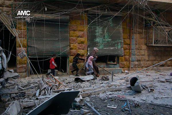 In a video posted by the Aleppo Media centre a rescue worker states: “‘Russian planes bombed Al Mashhad neighbourhood which led to the total destruction of two buildings. Then they targeted other liberated areas like al Ferdous and Bustan al Qasr. There are many dead and wounded. Every day the number is going up. Most of them are civilians. There are no militants. We have now carried out our duty and pulled out all the injured.”