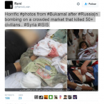 The Syrian Network for Human Rights reported that 71 civilians including nine or more children killed – and more than 100 people injured – when alleged Russian warplanes launched two airstrikes on the market in Al Bukamal. It added that more than 20 shops were destroyed and that a mosque, park and school were damaged while an ambulance burned.