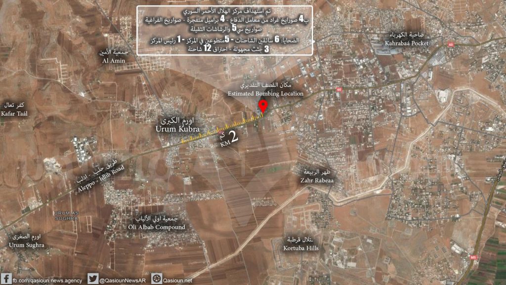 The Syrian Network for Human Rights reported that “government helicopters and fixed-wing warplanes, believed to be Russian, took part in a concentrated attack that comprised multiple airstrikes on a center for the Red Crescent in eastern Urm Al Kubra town. The bombardment lasted for three hours.”
