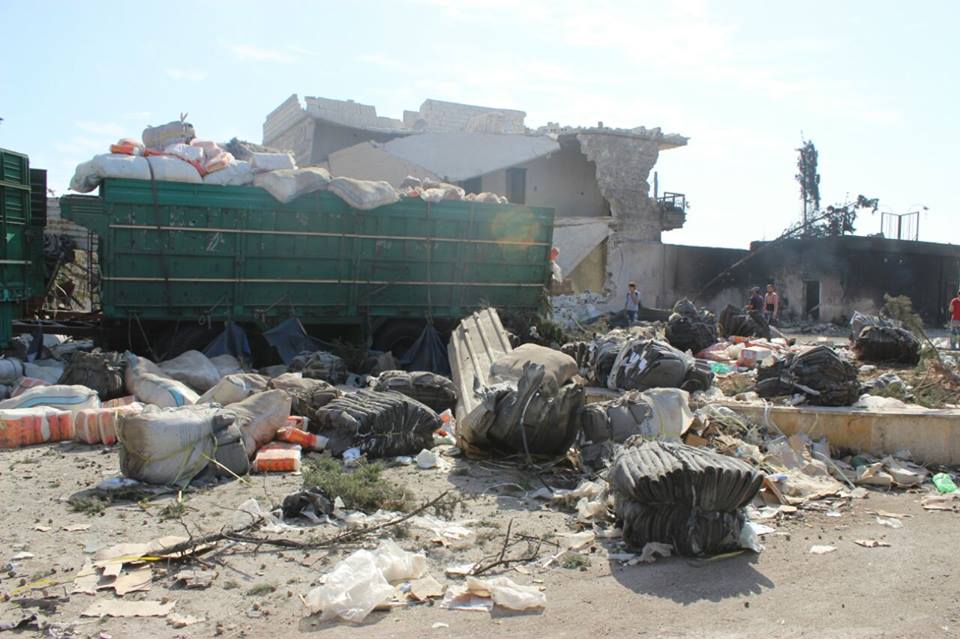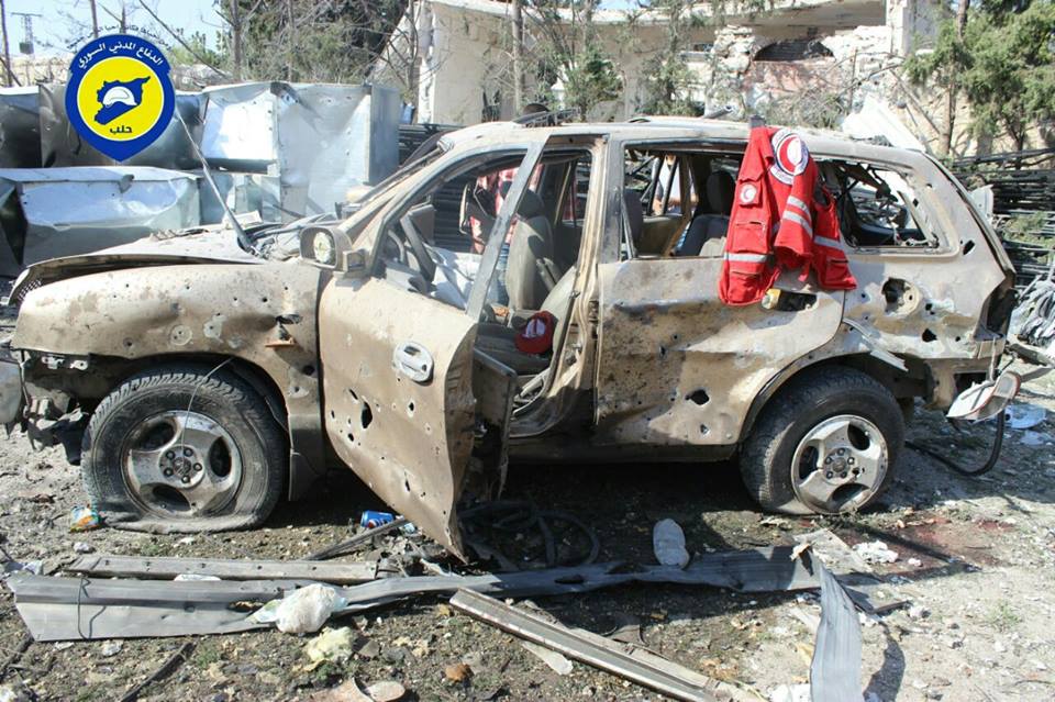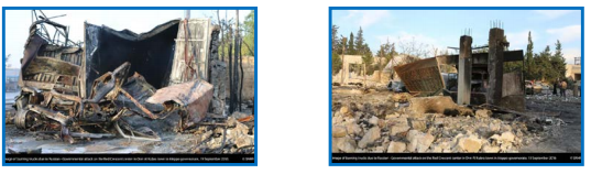 SN4HR went on to say that “government helicopters dropped no less than four barrel bombs while the fixed-wing Russian warplanes carried out nine airstrikes using missiles and heavy machine guns. The bombardment mostly targeted the Syrian Red Arab Crescent (SARC) center and destroyed a U.N. aid convoy of trucks that were supposed to deliver aid to warehouses belonging to the Red Crescent center. Additionally, the bombardment targeted also medical and civil defence teams who tried to rescue the wounded and injured relief workers.”