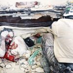 Photographs from @shaamnews and @AleppoAMC showed the extent of the devastation, with at least two large buildings torn apart. Photographs from Erem News showed two dead young children being carried out of the rubble, and Alqabas News released a photograph of one dead body covered in dust being pulled out.