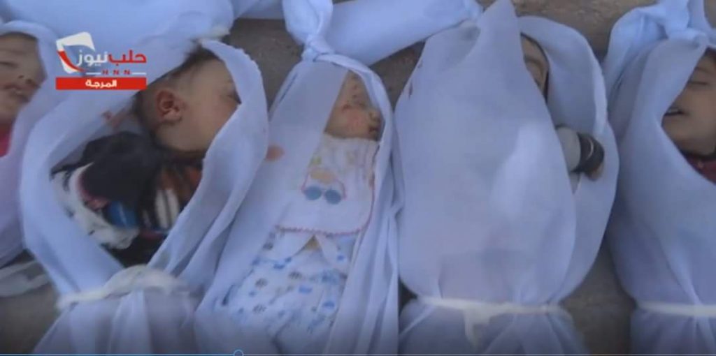 @iphs_tr – put death toll at 30 publishing images of a child who survived being treated in a medical facility. According to the White Helmets “the child Marouf” was rescued. Many sources published images of the children slain in this event: @ahmad09904 named a little girl as “Amira“, while @plespost posted a picture of five dead infants.