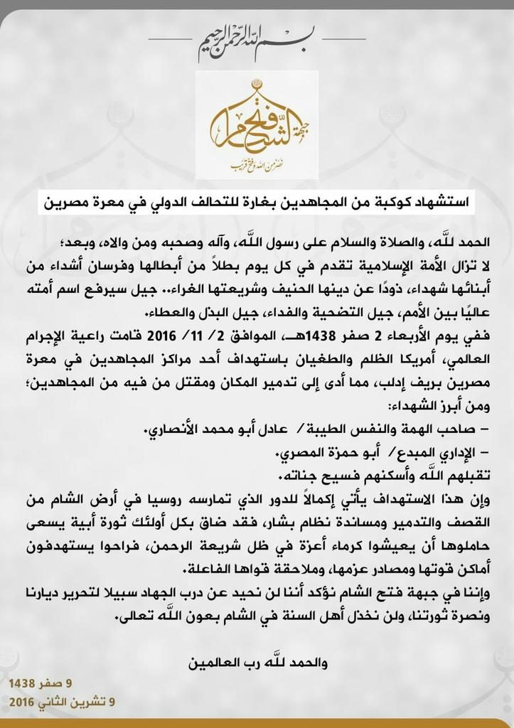In a statement released following the strikes, Fath al-Sham alleged ”the criminal world sponsor, America’s injustice and tyranny have targeted one of our Mujahideen centers in Maarrat Misrin.”