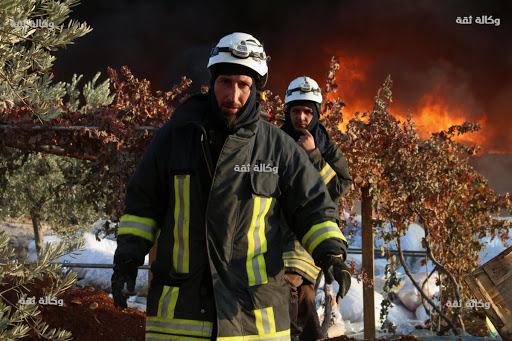 Videos posted by SDC Aleppo and Thiqa News show flames encircling the town of Al Mansoura.