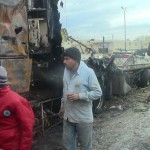Aljazeera Mubashner’s footage is entitled: ‘Aftermath of Russian bombing after they targeted relief trucks in Al Dana in Idlib.’ An interviewed man says the targeted vehicles were relief trucks carrying food for civilians. He points to a pile of boxes saying they had contained bananas, foodstuff and relief items, and claiming there were no militants present.