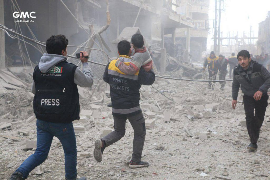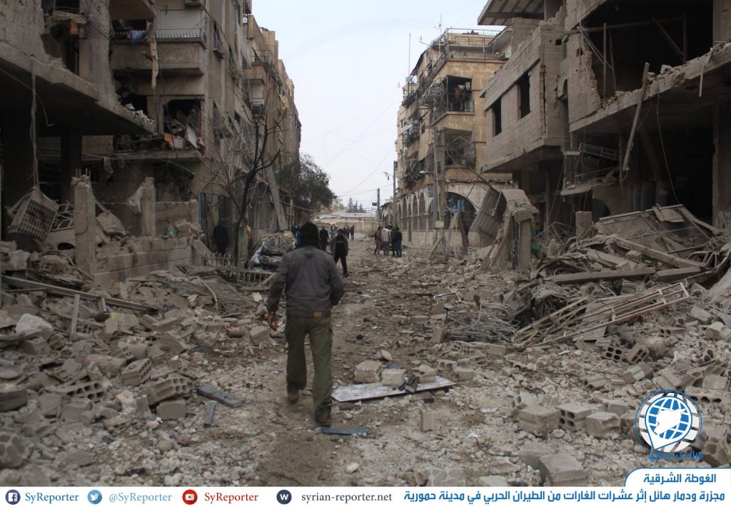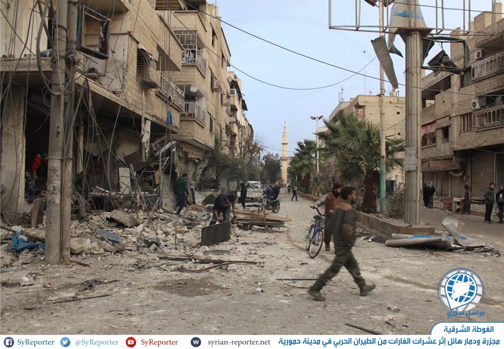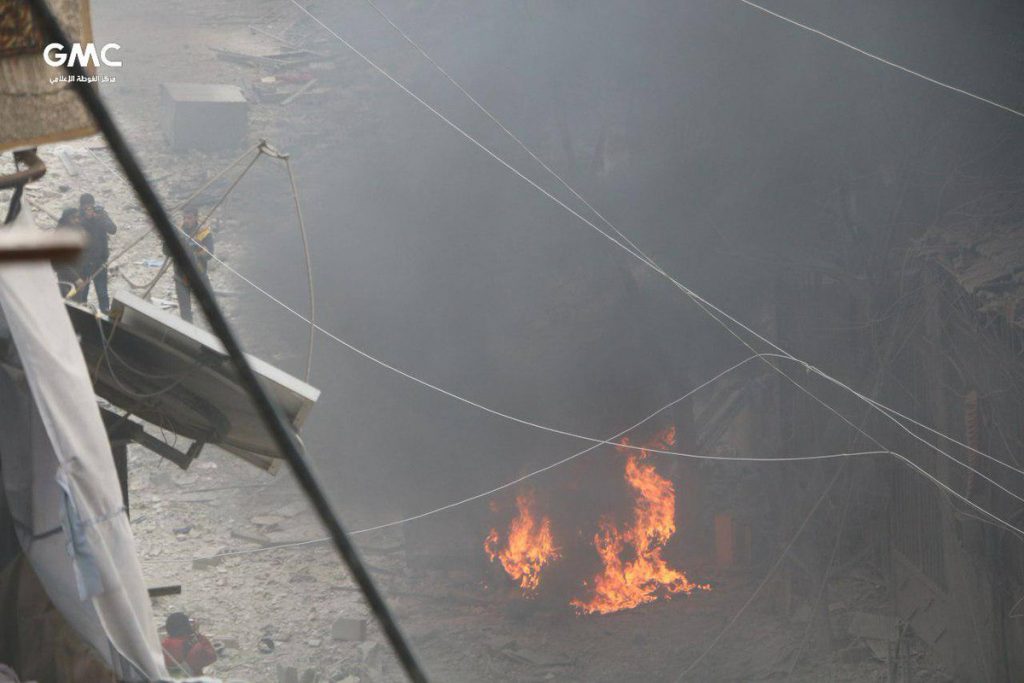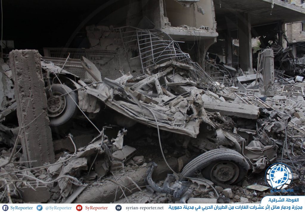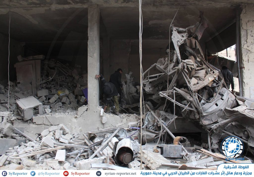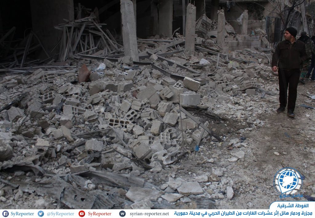 The Between 12 and 20 civilians were killed in air and artillery strikes which struck the residential vicinity of Hamouriya, local sources reported. The incident has been described as a “massacre”, with as many as 50 civilians wounded. Sources blamed both the Syrian regime and Russia. Moroever, many sources including Yrian Network for Human Rights blamed the “Syrian-Russian alliance”.