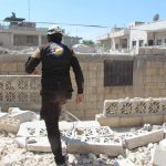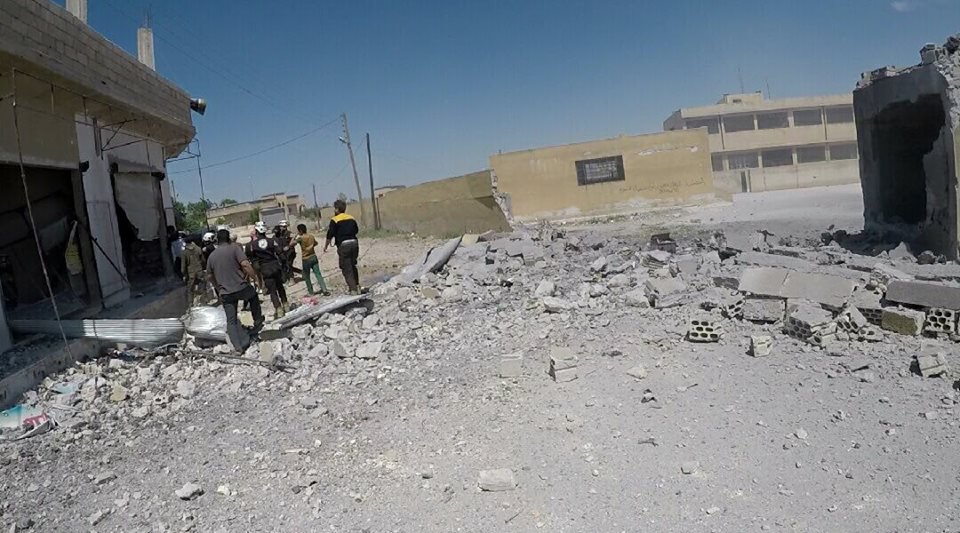 Two children were injured in Kafr Nabil, according to the Syrian Observatory for Human Rights, as warplanes struck the village. Helicopters simultaneous dumped explosive barrels bombs on Kafr Sajna, destroying a medical centre and the next door Tishreen school.