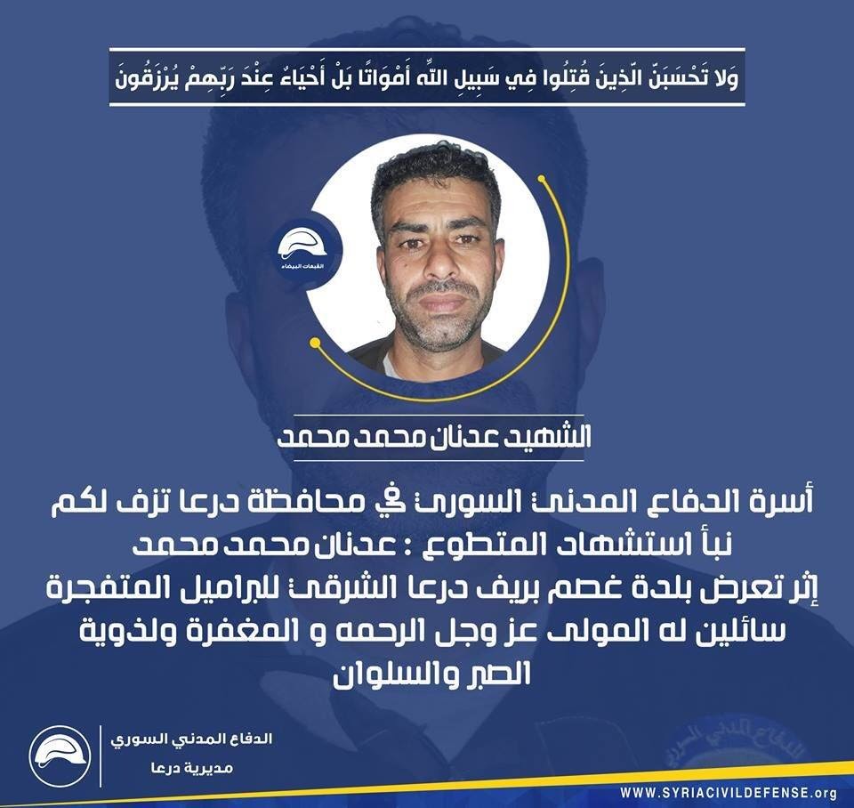 @SyriaCivilDefe mourned their volunteer Adnan Mohammad who was killed in this incident. “With great sadness and sorrow, the Syrian civil defense mourns the volunteer Adnan Mohammad who died after Ghasam in the eastern countryside of Dara’a was bombed with barrel bombs this morning.”